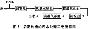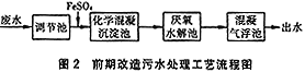 ① 調節池。設計原水調節池有效停留時間為8 h,整個調節池尺寸為20m×10m×2.5m ,內分6格。在原水進調節池前有一小渠道,在(zài)渠道中投硫酸(suān)亞鐵,使pH為7~9左右。廢水在調節池內有一初沉時間,對池底汙(wū)泥,紡織廠每年趁春節放假之(zhī)際清掏外運。