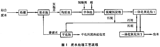 物化(huà)法(fǎ)和生化法聯合使(shǐ)用是處理印染廢水常規(guī)的典型工藝[1]。混凝沉澱具有脫色(sè)和去(qù)除懸浮物能力強(qiáng)的特點,同時所投(tóu)加的(de)混凝劑(jì)也可以(yǐ)起到一定的調節pH作用。生化法對溶(róng)解性的有機物去除能力強。在本工程中,由(yóu)於廢水中的主(zhǔ)要汙染物在pH為(wéi)6~9條件下為難溶(róng)性的對苯二甲酸和各種分散染料等,因此綜合廢水先經混凝沉澱,可(kě)有(yǒu)效地去除有機汙染物、色度和調(diào)節pH值,並提高廢水的生化性能,為後續生化處理創造有(yǒu)利條件。生化法(fǎ)采用 氧化溝工藝,適用於該印染廢水水質特點(diǎn)和對出(chū)水(shuǐ)水質高的要(yào)求。 廢水處理工藝流程詳見圖1。