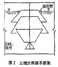 ①由於廢水(shuǐ)處理設施正好位於原(yuán)有(yǒu)的(de)池塘(táng)上,其地(dì)基承載力和土(tǔ)質均勻度都很差,如采用鋼筋混凝土結構(gòu),由(yóu)於其自重(chóng)大,地(dì)基處理費用就相當高。厭(yàn)氧罐和貯氣(qì)櫃設計采用德國引進的Lipp罐(guàn)體(tǐ),由於罐體自重輕(qīng),基礎比較容易處理,費用隨(suí)之降低。厭氧消化罐高為9 m,直(zhí)徑為(wéi)7 m,是地上式圓形Lipp罐。由於對厭氧消化罐的(de)徑、高比進行了調整,原有的三相分離器就不是很適合。因此,對(duì)三相分離器進行了重新設計,采(cǎi)用三層(céng)鋼結構漏鬥式導流(liú)板做三相分離器(見圖(tú)2)。從使用結果看,三相分離效果相當好,厭氧汙泥流失(shī)量很小,汙泥截留效果明顯(xiǎn)。